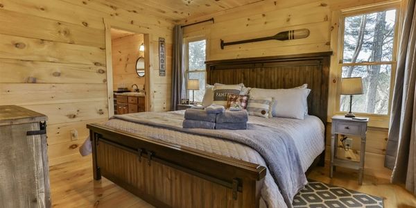 A private lakeside cabin sits on the retreat property, separate from the main workshop space. The cabin offers two beautiful guest rooms, each with its own bath and shared access to the cabin’s private spa.
